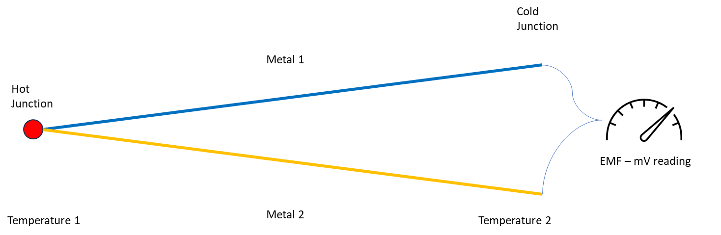 A thermocouple consists of two conductors produced from dissimilar metals. One end of the conductor pair is formed into a junction (the hot junction) and placed in the area to be measured. The other end of the conductor pair (the cold junction) is connected to the measuring instrument. When the two junctions are at different temperatures a small electromotive force (emf) is created. This is known as the ‘Seebeck effect’, discovered by the German physicist Thomas Johann Seebeck in 1821.